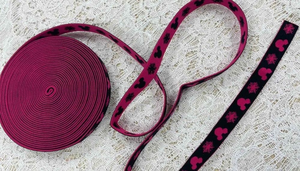 Резинка Декоративная ш. 15 мм. Розовый Микки и снежинки на чёрном
