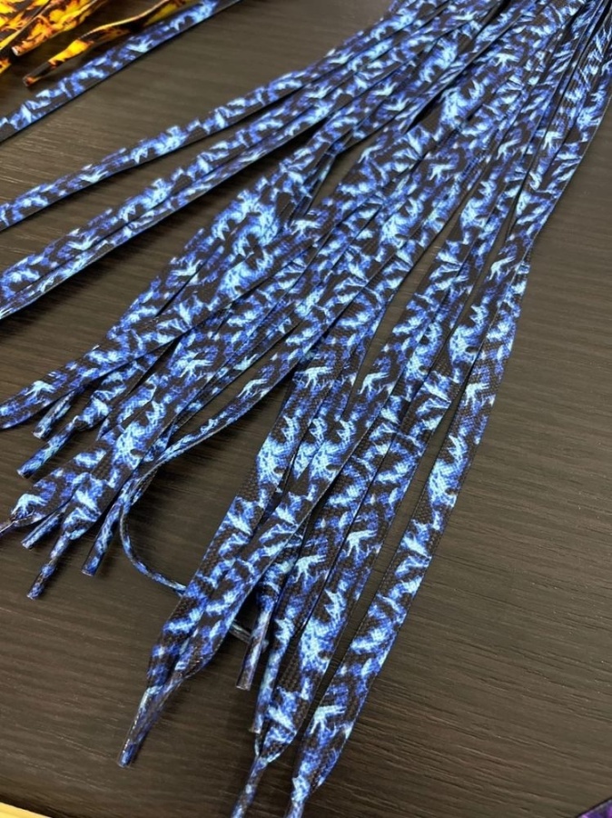Шнурки плоские 120 см., ш. 8 мм., пластиковый наконечник, синий огонь на чёрном